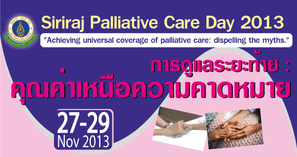 คณะแพทยศาสตร์ศิริราชพยาบาล โดยคณะกรรมการดำเนินการ Palliative Care กำหนดจัดการประชุมวิชาการ Siriraj Palliative Care Day 2013 ขึ้น ภายใต้ชื่องานว่า “Achieving universal coverage of palliative care: dispelling the myths.” “การดูแลระยะท้าย: คุณค่าเหนือความคาดหมาย” ในระหว่างวันที่ 27-29 พฤศจิกายน พ.ศ. 2556 ณ ห้องประชุมราชปนัดดาสิรินธร อาคารศรีสวรินทิรา ชั้น 1 โรงพยาบาลศิริราช คณะแพทยศาสตร์ศิริราชพยาบาล ผู้สนใจเข้าร่วมประชุมสามารถสมัครเข้าร่วมประชุมได้ผ่านทางเว็บไซต์ของศูนย์บริรักษ์ศิริราช (http://wwwl.si.mahidol.ac.th/palliative) สอบถามรายละเอียดเพิ่มเติมได้ที่ ศูนย์บริรักษ์ศิริราช โทรศัพท์ 0-2419-9679 ถึง 80